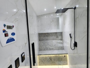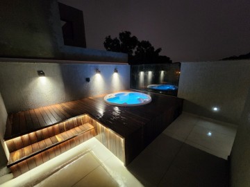 Subindo, novamente tem-se uma escada revestida com granito, com iluminação automatizada com guarda corpo de vidro. Chegando no ático depara-se com uma ampla sala de eventos familiares que conta com infraestrutura para internet banheiro com granito esculpido, box e metais instalados. No atico externo um amplo espaço com deck de madeira, led, iluminação planejada e SPA com vista para a região.
