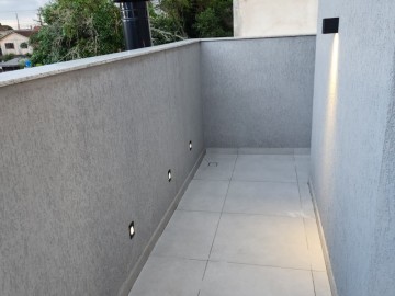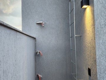 Aproximando-se da escada os balizadores se iluminam automaticamente, trazendo mais funcionalidade e conforto no acesso ao segundo pavimento. A escada é revestida com granito, guarda corpo de vidro e moldada degrau a degrau tranzendo muita personalidade e modernismo.