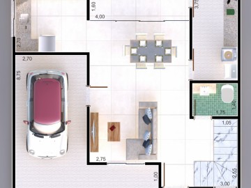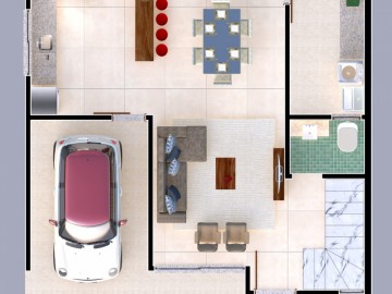 A planta inteligente com uma sala ampla, cozinha integrada e área de churrasqueira a carvão, perfeita para momentos de confraternização.