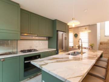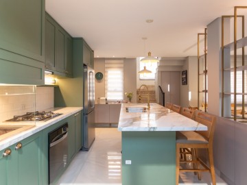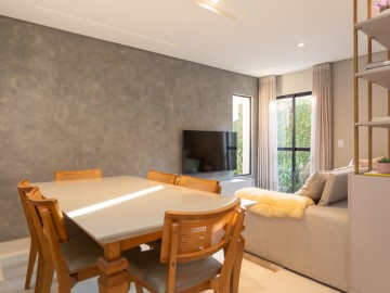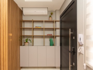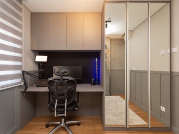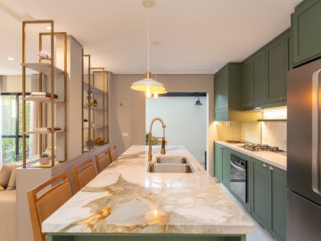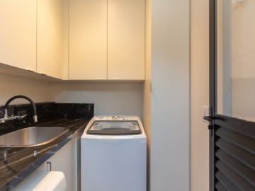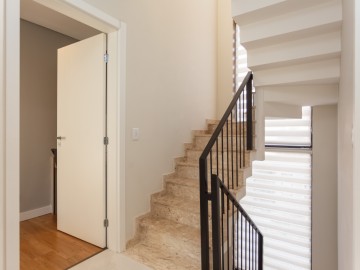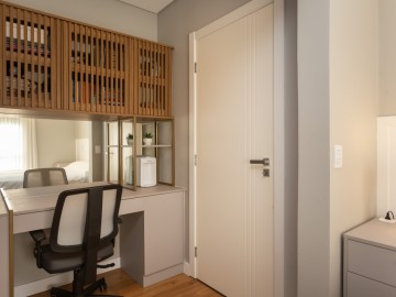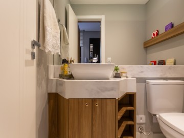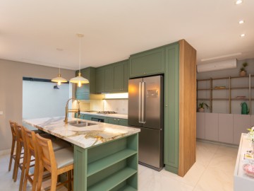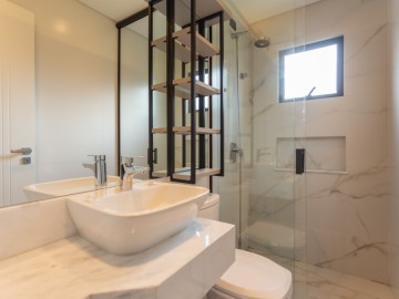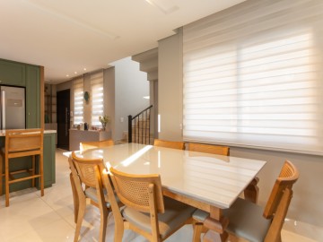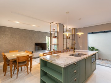 No térreo, entramos no Hall que possui estante e armários, o painel amadeirado deixa discreto a entrada para o lavabo, o lavabo é espaçoso, com cuba de sobrepor e armário. A cozinha possui móveis de alto padrão, com ilha e bancadas em mármore calacatta, integrada com a sala de jantar, embaixo da escada há um pequeno depósito. Ainda no térreo, há uma área de serviço com uma pia auxiliar e cooktop de 2 bocas, a lavanderia possui máquina de secar, máquina de lavar, e armários.