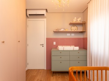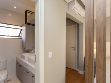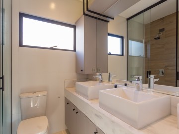 No primeiro piso estão 3 dormitórios, sendo 1 suíte. O banheiro social com armários e espelho amplo, box até o teto e ducha de alta pressão docol. A suíte possui closet, penteadeira e espaço para até cama king size, o banheiro da suíte possui duas cubas e dois chuveiros.