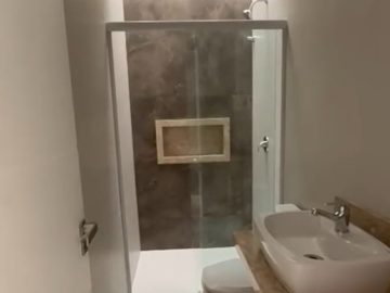 Piso laminado colocado, mármore travertino na escada e bancadas dos banheiros.